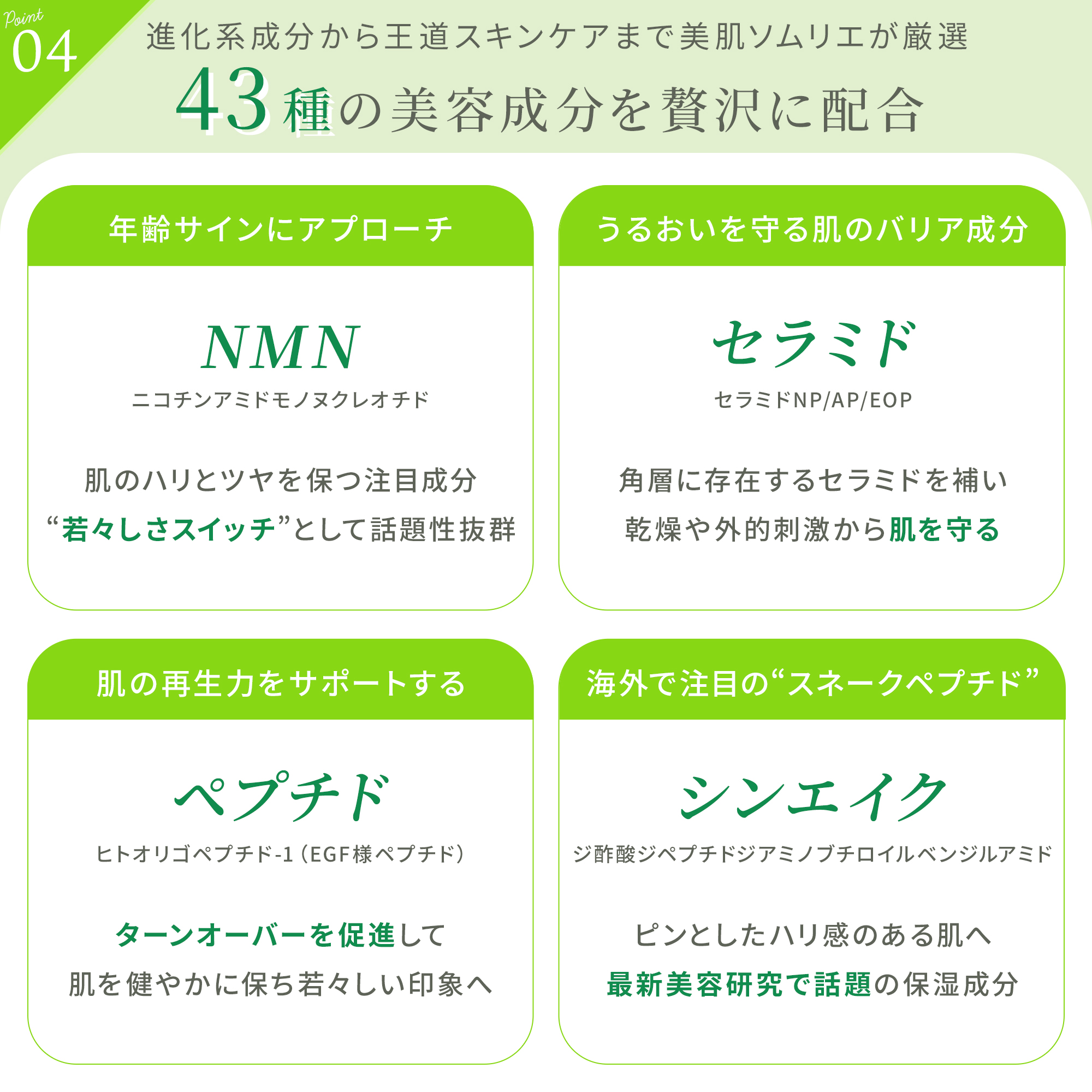 ワンランク上の「エイジングケア」を目指すため、そして本当に結果がでるクリームをお届けするために、エイジングケアに特化した成分を吟味し、配合しました。エクソソームに始まり、ヒト幹細胞エキス、EGF、FGFなどの成長因子、そして王道のプラセンタエキス等、43種の成分を絶妙にブレンド。様々な成分が絡み合い、悩み肌をサポートします。